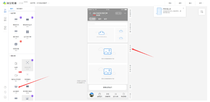 选择首页点击,进入页面编辑内容,将图文类,定向模块,拖至店铺首页醒目位置,最后保存发布。